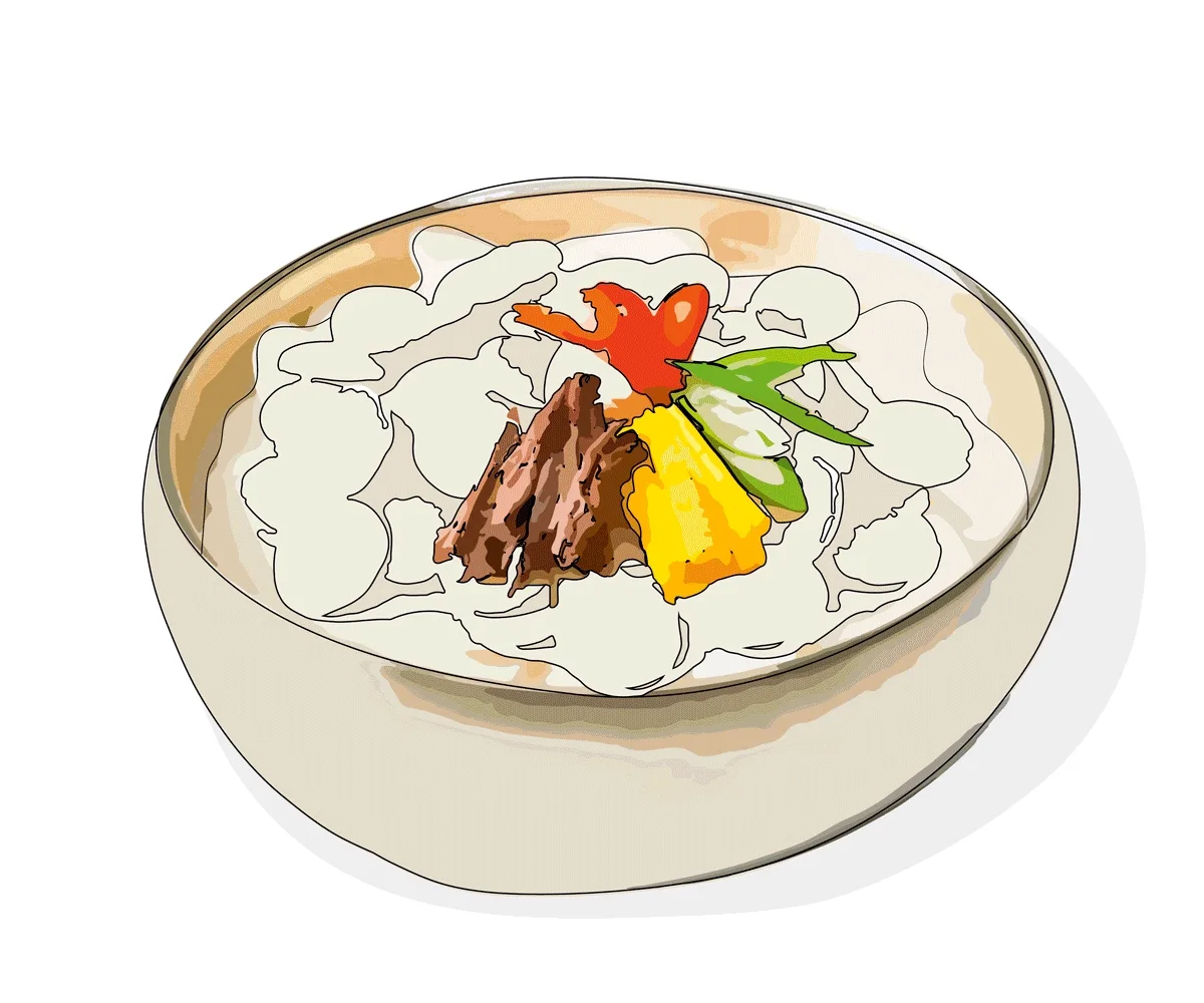 Jeong remembers her grandmother would have a giant stockpot of beef broth on the stove, in which she simmered chewy tteok (rice cakes), sliced into ovals to symbolise coins and prosperity, with the snow-white hue representing purity and a “clean slate” for the new year. The lot is ladled into bowls and garnished with spring onions, slices of beef, gim (dried seaweed sheets) and thinly sliced omelette. It’s a subtly flavoured dish that’s gussied up with a side of kimchi, and usually forms part of a larger banquet that could include galbi-jjim (braised short ribs), jun (the catch-all term for Korean fried savoury pancakes) and mandu (dumplings). “And japchae [stir-fried sweet-potato noodles],” says Jeong. “It’s a party dish.” – YCL