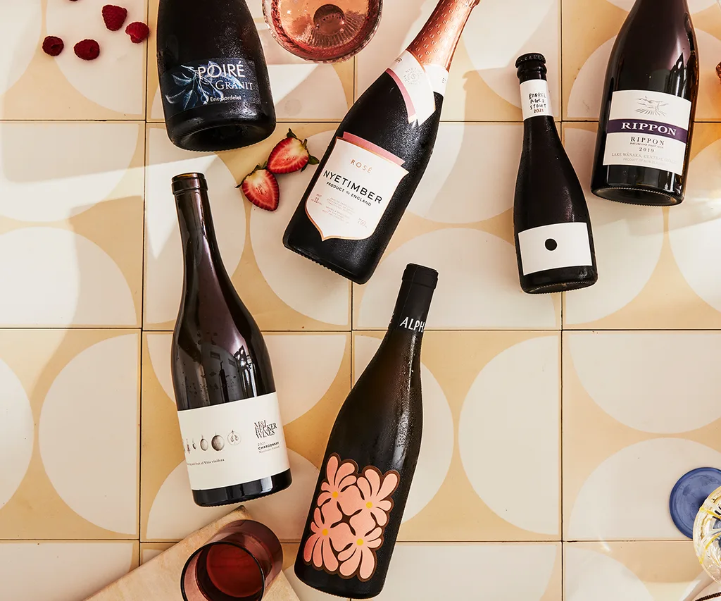 From left to right: 2021 Eric Bordelet Poiré Granit Cider, 2021 M&J Becker Manchester Vineyard Chardonnay, MV Nyetimber Rosé Sparkling, 2022 Alpha Box & Dice X 004 Moscato, 2022 Moo Brew Barrel Aged Stout and 2019 Rippon Mature Vine Pinot Noir.