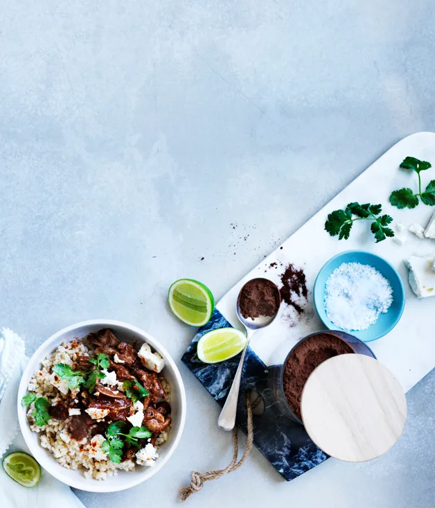 Toast 2 torn corn tortillas and 2 tbsp pumpkin seeds in a dry frying pan over medium-high heat until evenly browned (2-3 minutes), then process in a food processor with 1 chopped Spanish onion, 2 chopped long red chillies and 2 garlic cloves to a paste. Heat 2 tbsp olive oil in a large saucepan over medium-high heat, add onion mixture, and sauté until tender (4-5 minutes), then add 2 tsp each ground cumin, ground coriander and ground pasilla chilli, and 2 cinnamon quills. Fry until fragrant (1 minute), then add 250ml chicken stock, 200ml tomato polpa and 1 finely chopped chipotle chilli in adobo, and bring to a simmer. Add 8 skinless chicken thigh fillets, season to taste, cover with a lid, reduce heat to low and simmer until chicken is tender (6-8 minutes). Remove chicken from pan and set aside. When cool enough to handle, coarsely shred meat. Meanwhile, add 2 tbsp Dutch-process cocoa to pan, simmer until sauce thickens and reduces slightly (10-15 minutes), then return meat to pan, heat through, check seasoning and serve with steamed rice, coriander, crumbled feta and lime wedges.