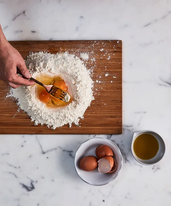 Pile flour onto a dry (preferably wooden) surface. Form a well in the centre and add eggs and olive oil. Beat the eggs and oil with a fork and slowly incorporate flour by scraping against the flour wall.