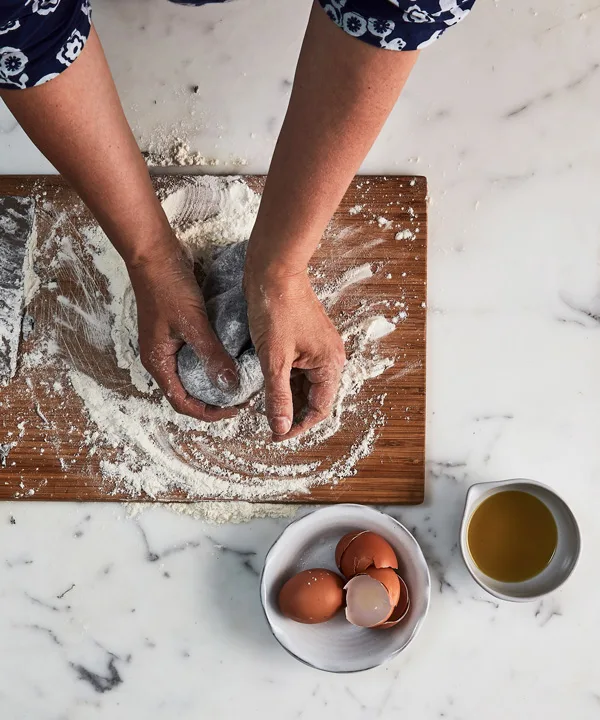 There are two types of dough for making pasta: the first, made from durum-wheat semolina, a coarse flour high in protein, is used for pasta such as orecchiette, pici, fusilli, spaghetti, penne and rigatoni. The second style of dough, as seen in the recipe below, is one made of soft flour containing slightly less gluten and more starch. Combined with eggs, it makes a soft dough that is great for filled pasta like tortellini, agnolotti, tortelli and ravioli, as well as silky ribbons of pasta such as fettuccine, pappardelle and lasagne. The main secret of good pasta dough lies in the quality of the ingredients: organic flour and eggs are best.