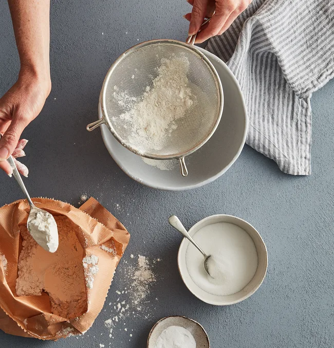Sift plain flour, baking powder, caster sugar and fine salt into a large bowl.