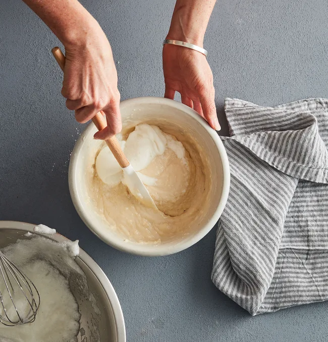 Fold in eggwhites with a spatula, being careful not to deflate the whites. Once the batter has just come together, stop mixing.