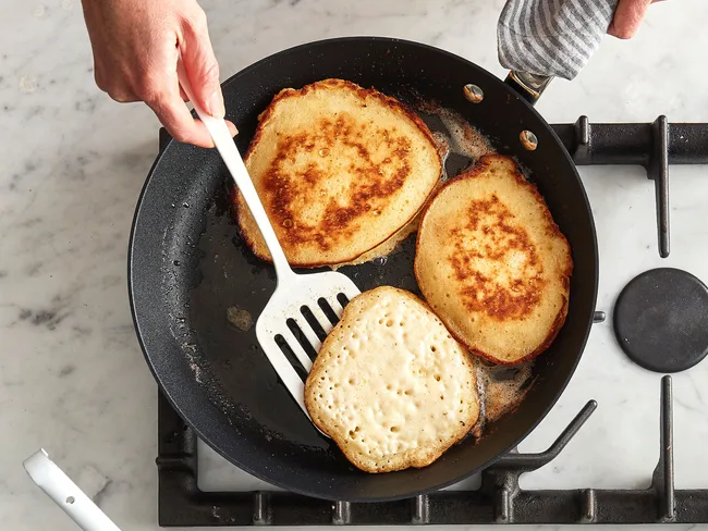 Add a few ladles of batter to create rounds and let the batter fry in the pan until a lot of bubbles come to the surface (2-3 minutes). Flip, and cook until set on the bottom (2-3 minutes). The more butter you use (well, to a point), the crisper your pancakes will be.