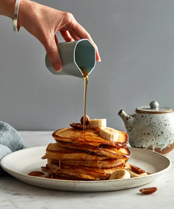 My favourite toppings are fresh sliced banana, roasted pecans, and maple syrup. In Australia, malt syrup is an awesome alternative. Stay away from the fake maple stuff. I am also a sucker for pancakes with canned peaches and crème fraîche – it sounds naff, but it’s super tasty.