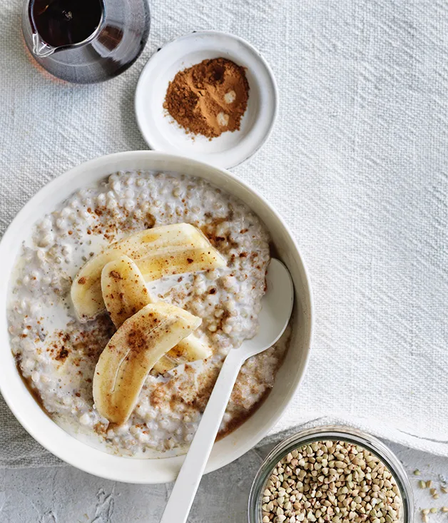 Cover 200gm buckwheat in 250ml boiling water in a saucepan and soak for 5 minutes. Add 350ml milk or almond milk, 1 sliced banana, ¼ tsp ground cinnamon and a pinch of salt, bring to a simmer and cook, stirring occasionally, until beginning to thicken (10-15 minutes). Add another 250ml milk and simmer until thick and buckwheat is creamy (10-15 minutes). Serve topped with extra sliced banana, cinnamon and maple syrup.