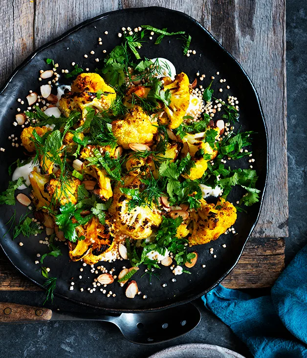 Roasted cauliflower salad with yoghurt dressing and almonds