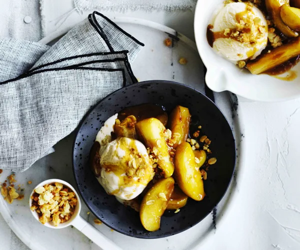 Spiced fuji apple crumble with dulce de leche ice-cream