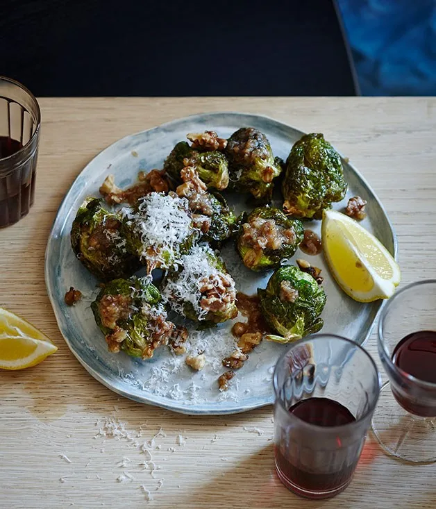 Brussels sprouts with walnut dressing, lemon and pecorino