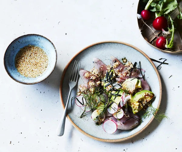 White fish crudo with avocado, herbs and cucumber-lime dressing