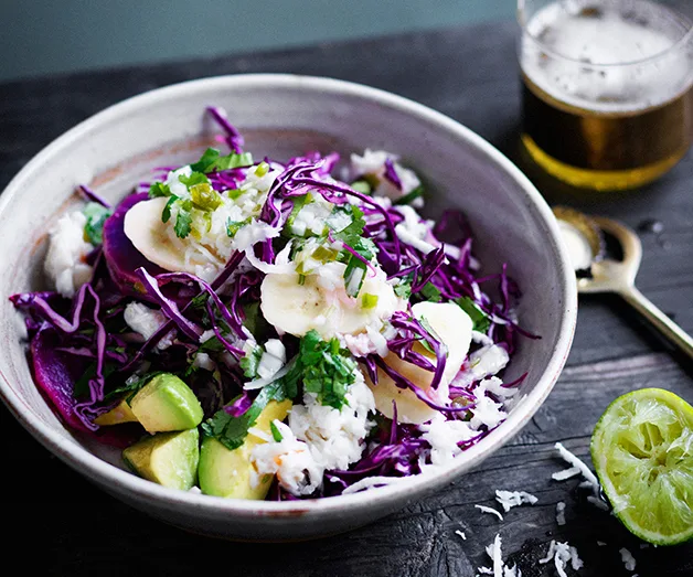 Sweet potato, green banana and crab with coriander-jalapeño dressing