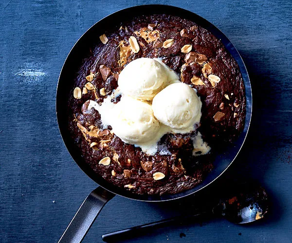 Warm chocolate and peanut butter skillet brownie
