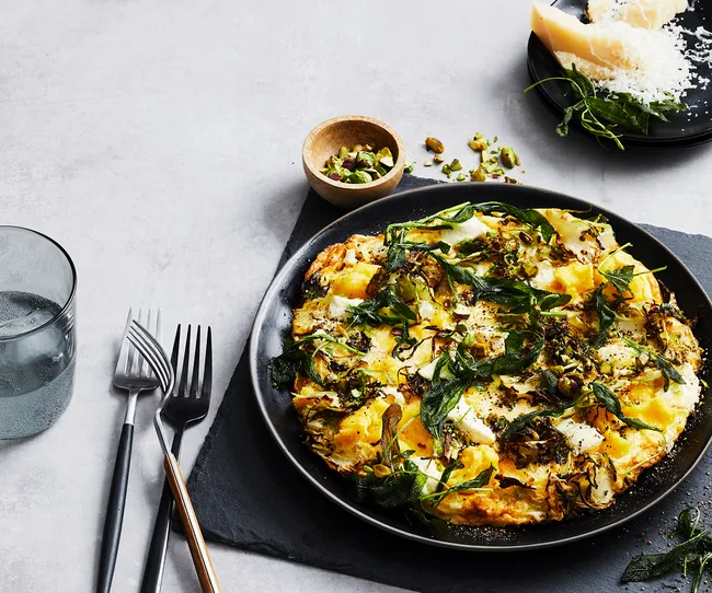 Feta and polenta frittata with crisp Brussels sprouts