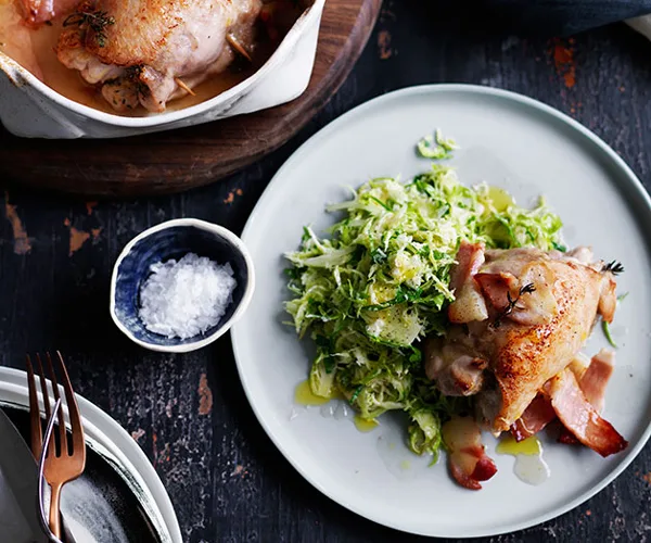 Thyme and garlic roast chicken with Brussels sprouts slaw