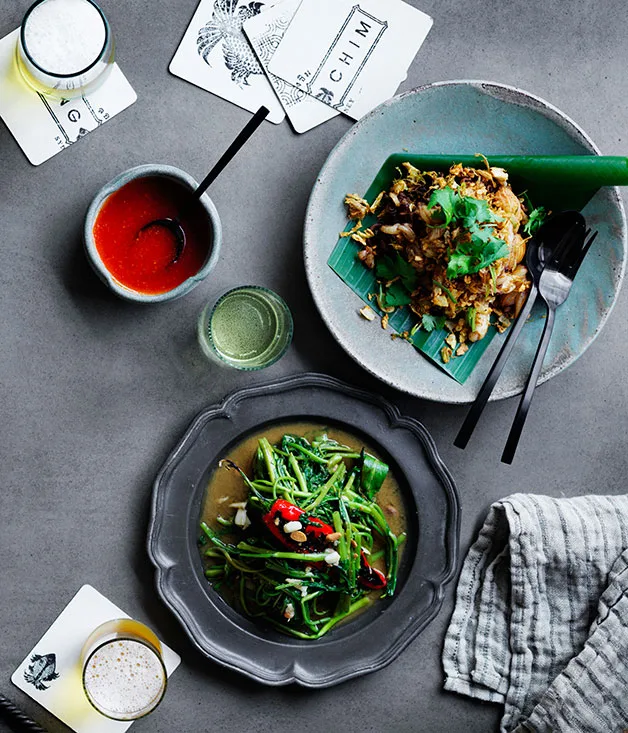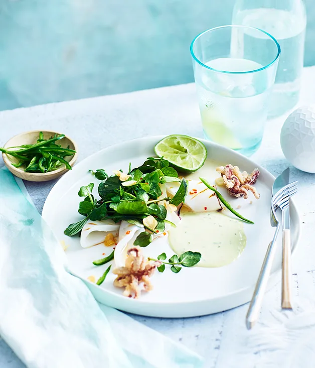 Jimmy Wah’s grilled squid with watercress, green chilli mayo and fried garlic