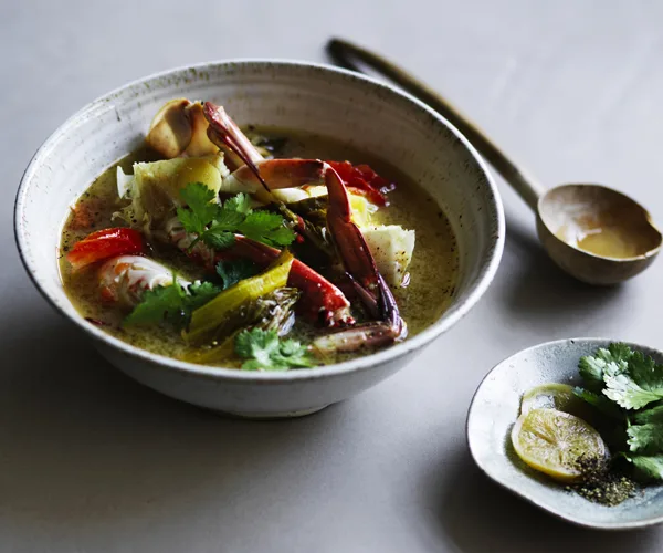 Tony Tan’s crab soup with pickled vegetable and tomato
