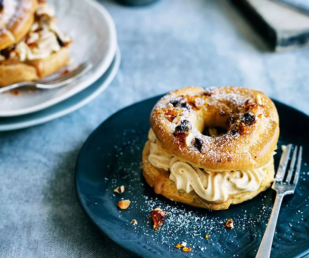 Choux wreaths with burnt-honey cream, raspberries and sesame praline