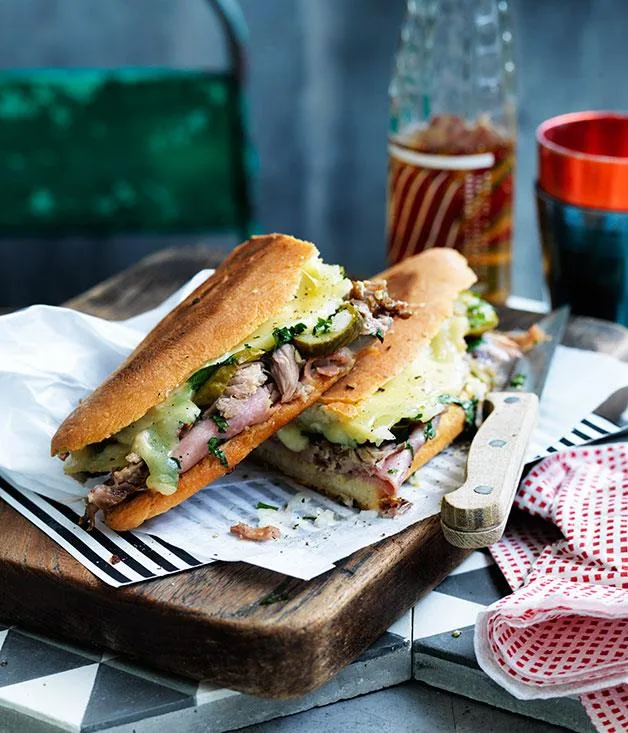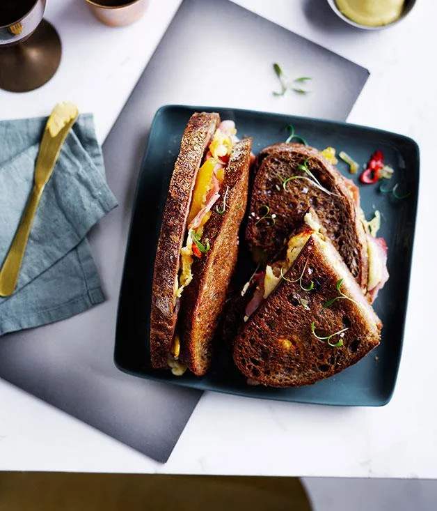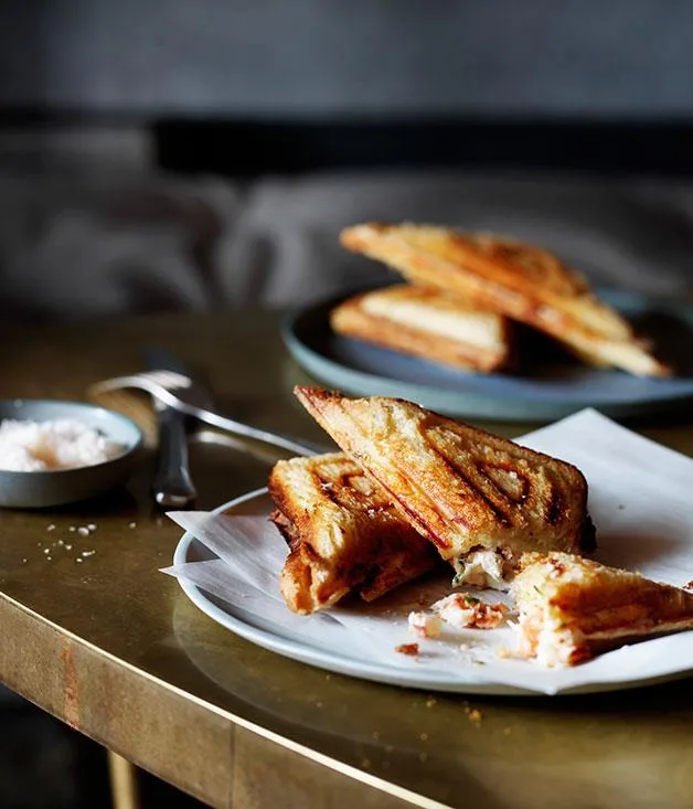 Ham and cheese toasties with quick-pickled cucumber