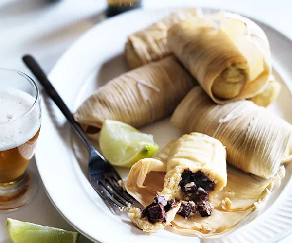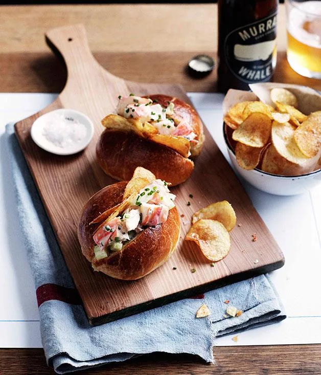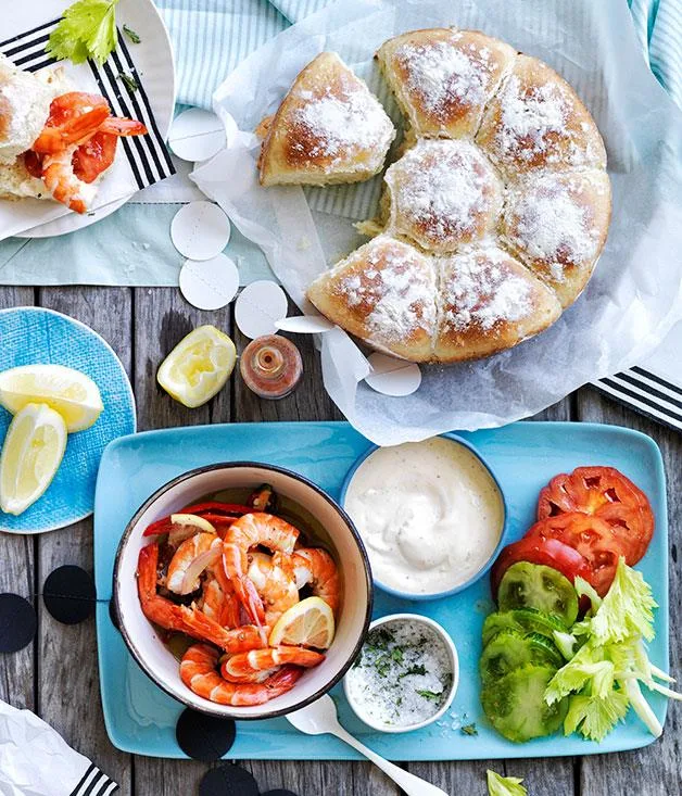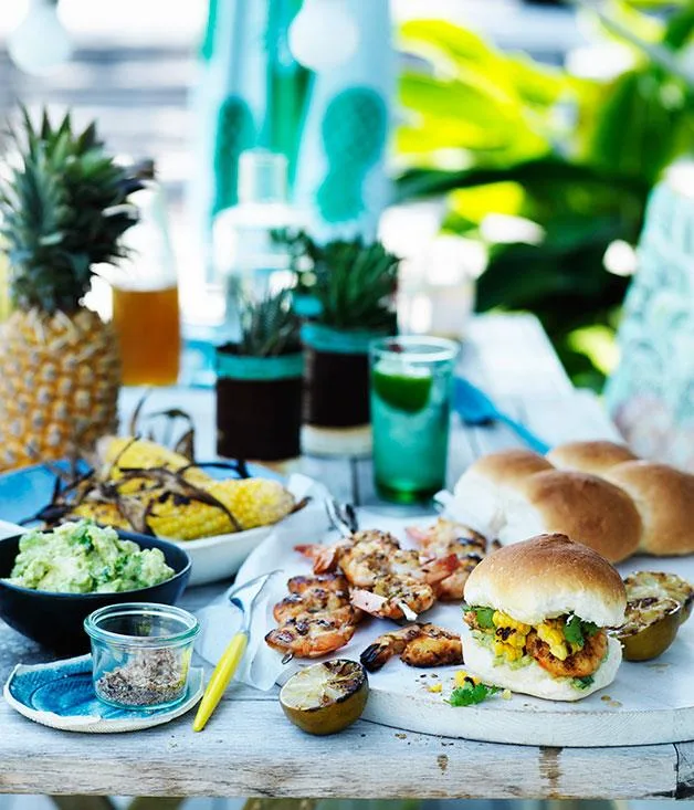 Barbecued prawn and corn rolls with smashed avocado