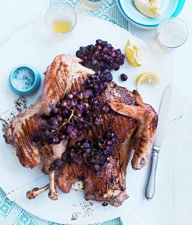 Whole barbecued turkey with buffalo ricotta and blistered grapes