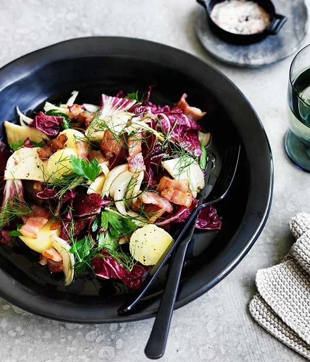 Tarragon chicken thighs with crisp prosciutto, fennel and cabbage