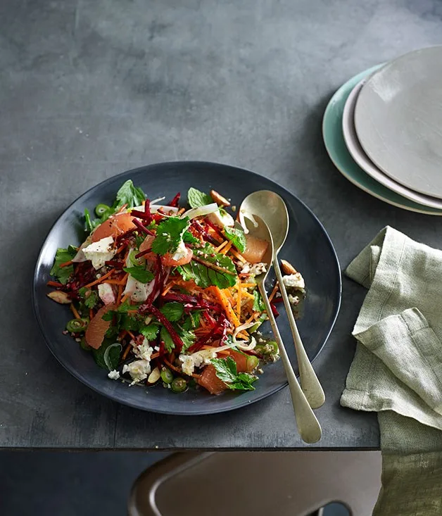 Raw fennel, beetroot and carrot salad with freekeh and almonds