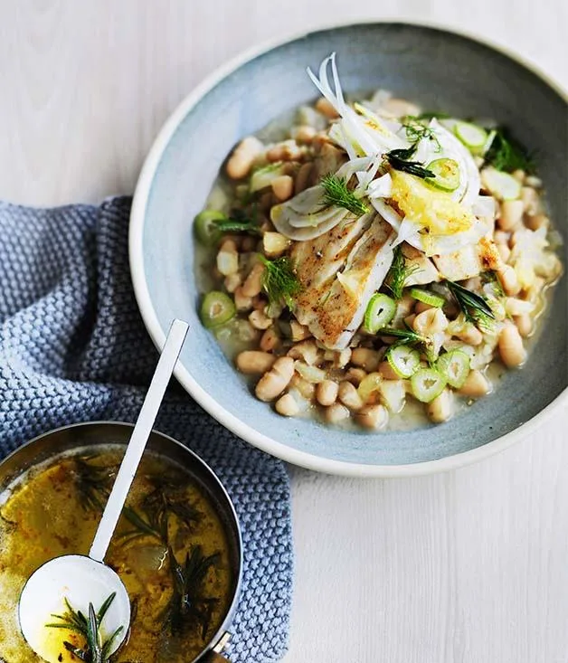 Kingfish crudo with white beans, fennel and blood-orange dressing