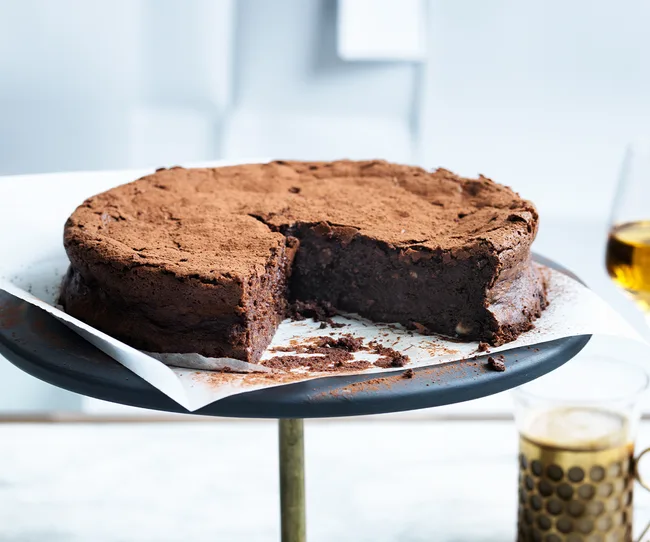 Gluten-free chocolate, prune and walnut cake with chocolate and sherry ganache