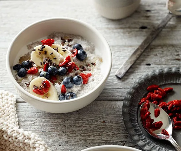 Chia-seed puddings with blueberries, banana and goji berries