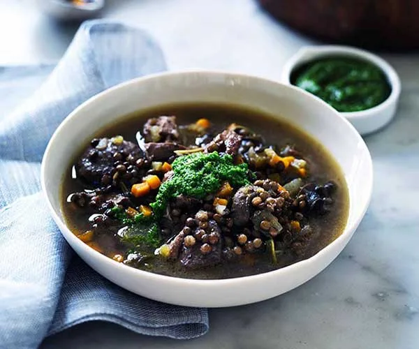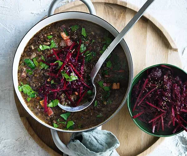 Lentil and speck soup with beetroot slaw