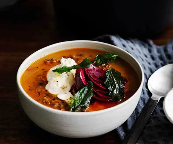 Persian red lentil soup with tahini, beetroot and fried mint