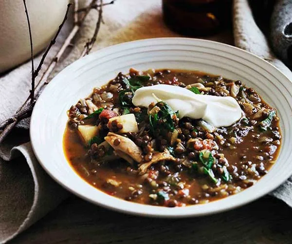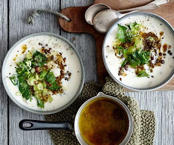 Rustic, comforting and simple; lentils of any colour form a hearty, nourishing base for cold-weather soups. The red lentil soup with yoghurt and coriander takes its cues from the Middle Eastern dish shorbat adas, and does wonders to revive the soul, as does the red lentil and beetroot number (don’t forget that final dollop of garlicky tahini). For more creature comforts, whip up the soup of chicken, kale and lentil; or for some spice in your life, make the green lentil and pumpkin soup with harissa.