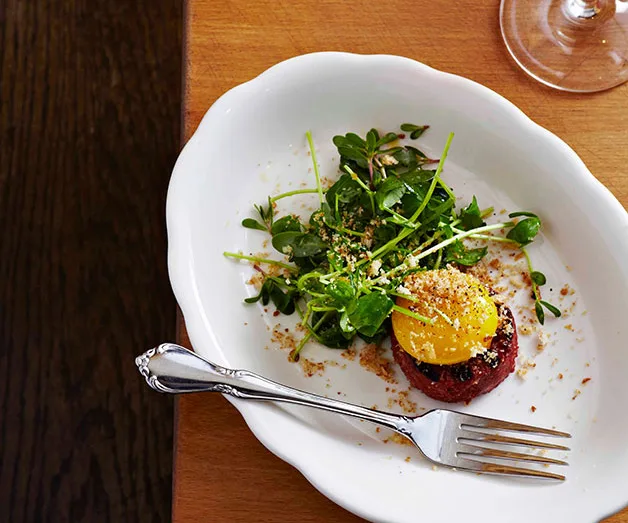 Torrisi’s fresh pepperoni, steamed egg yolk, mint