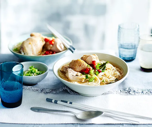 Chicken and egg noodle soup with ginger and chilli