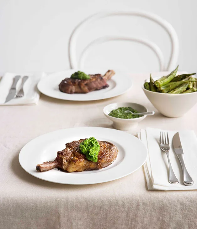 Beef rib-eye with chilli and herb sauce and roast okra