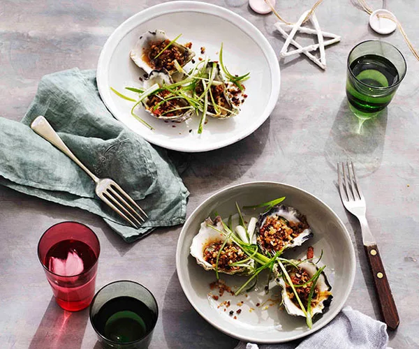 Barbecued oysters with bacon-chilli-tamarind sauce
