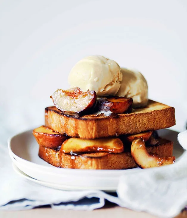 Peach brioche toasties with malted milk ice-cream