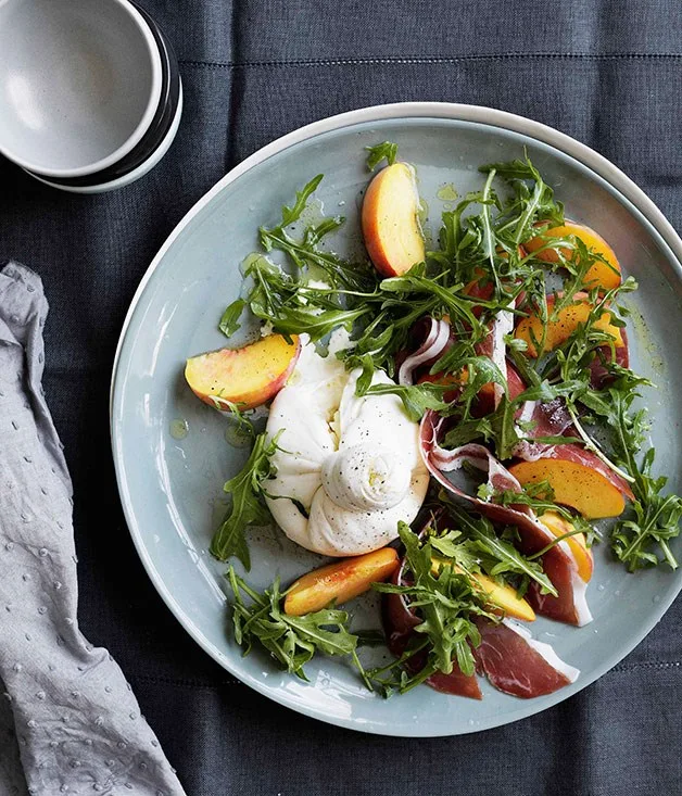 Peaches with burrata, prosciutto crudo and rocket