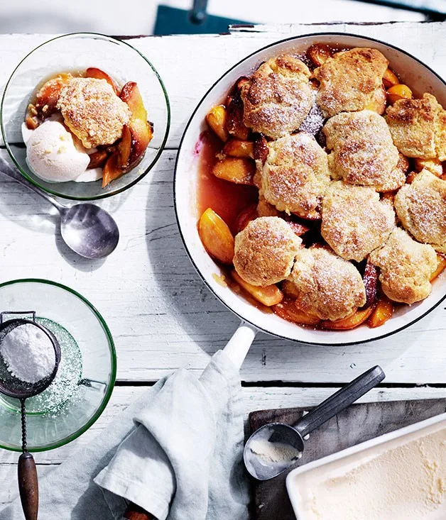 Cast-iron peach cobbler with buttermilk ice-cream