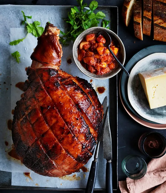 Peach and bourbon-glazed ham with fresh peach relish