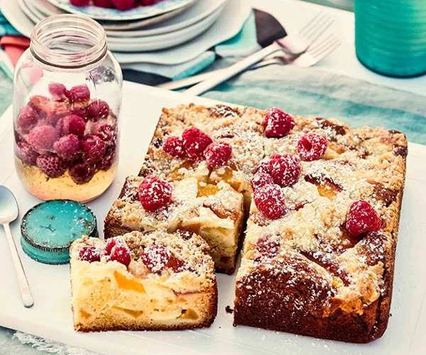 Peach, raspberry and ricotta crumble cake