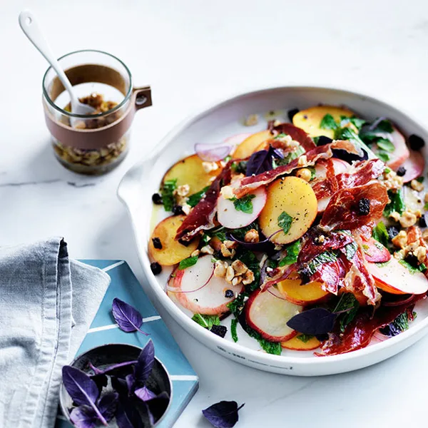 Peach, basil, jamón and pumpernickel salad
