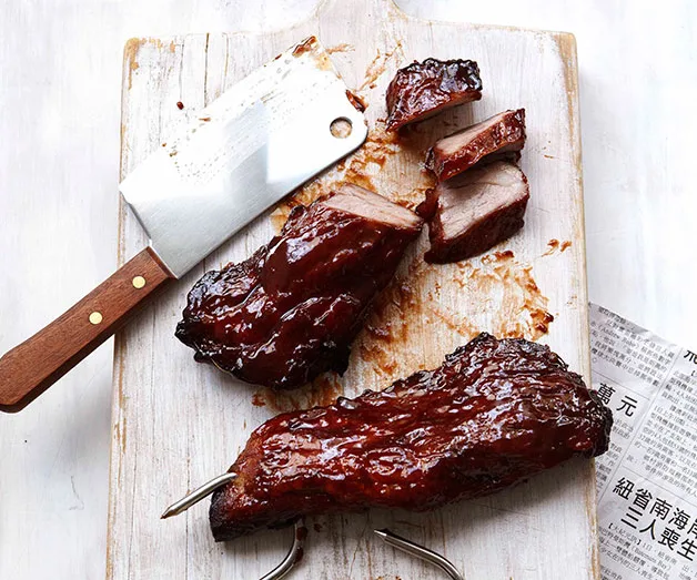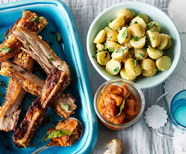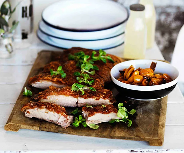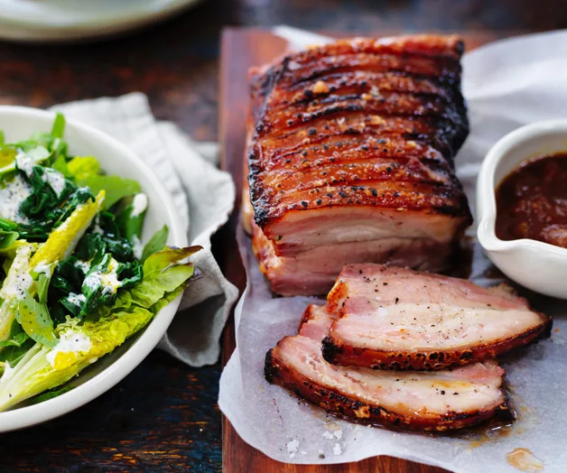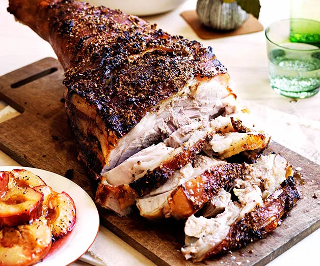 (Credits: Ben Dearnley)Roasted pork with the best crackling and roasted nectarines