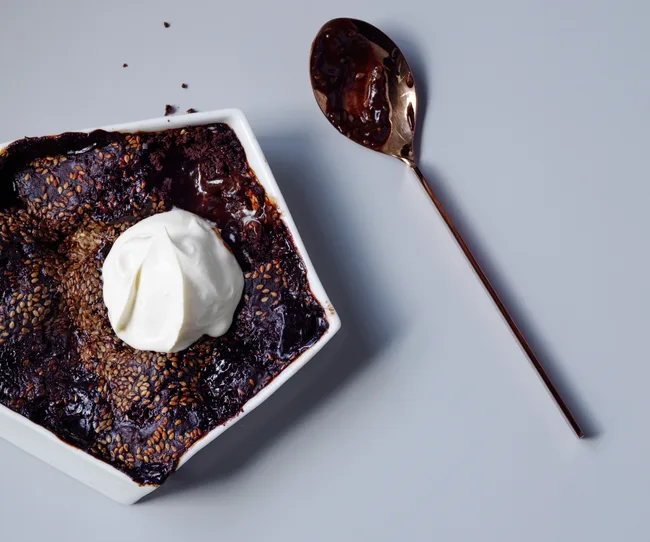 Chocolate self-saucing pudding with miso and sesame crunch