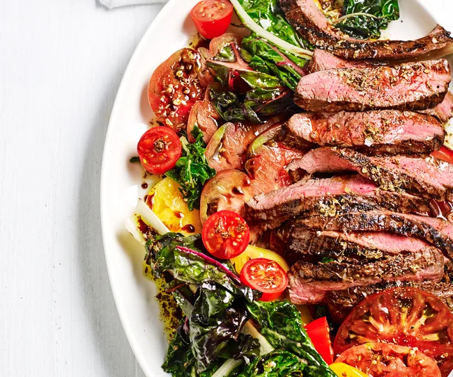 Grilled hanger steak with spiced vincotto and rainbow chard
