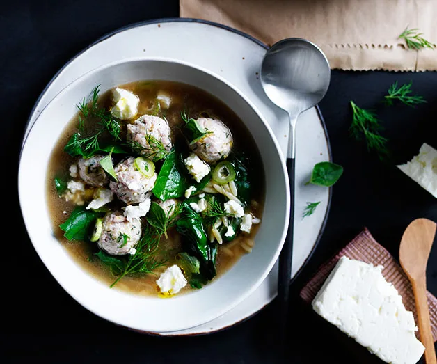 Tiny chicken meatball and orzo soup with silverbeet and feta