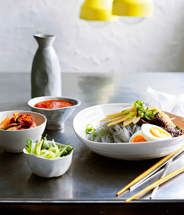 Korean buckwheat noodles with beef and nashi