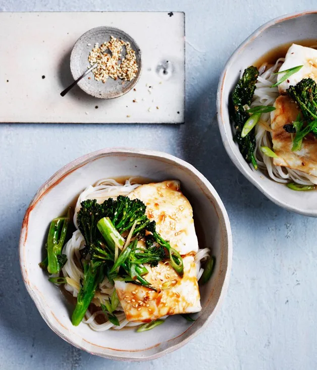 Roast fish with soy, noodles and broccolini