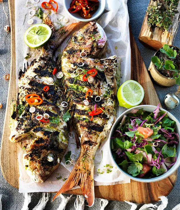 Three Blue Ducks’ barbecued whole snapper with lemongrass and lime leaves