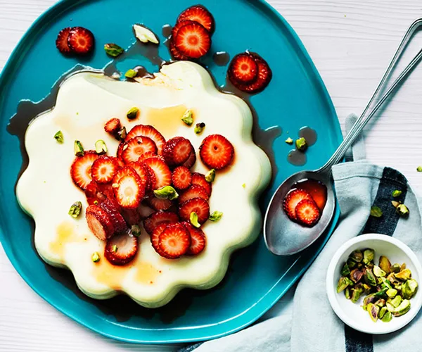 Curtis Stone’s yoghurt panna cotta with strawberries and rosewater